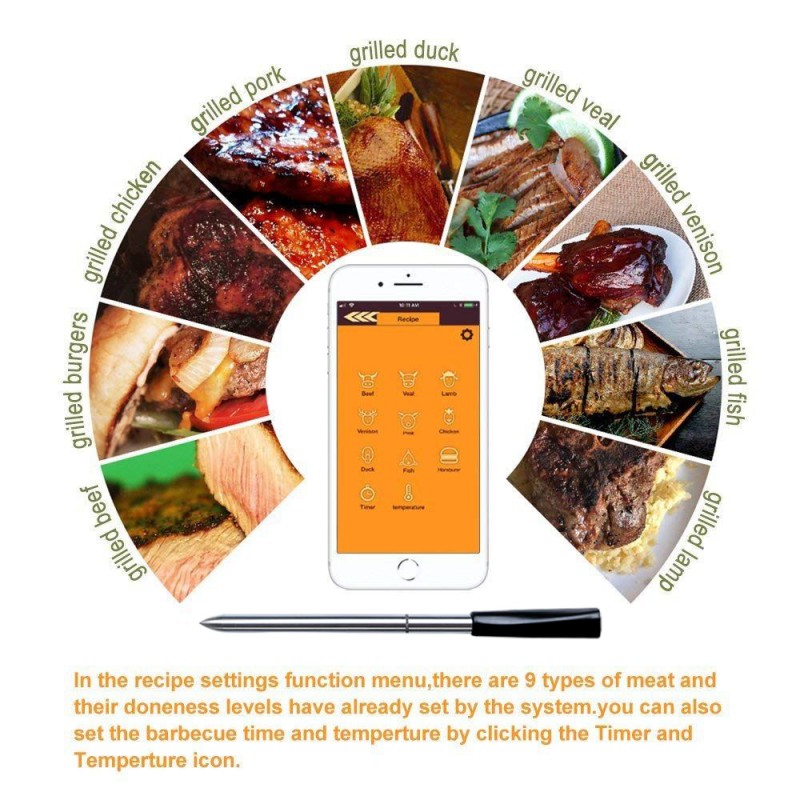 ????Bezprzewodowy zdalny Monitoring:Termometr do mięs Bluetooth z profesjonalnym zdalnym sygnałem do 100 stóp, jest połączony z darmowa aplikacja, która jest kompatybilna z IOS i Android, i dostaje odczyty temperatury w telefonie. Nigdy nie przegapisz imprezy i ciesz się zdalnym grillem.