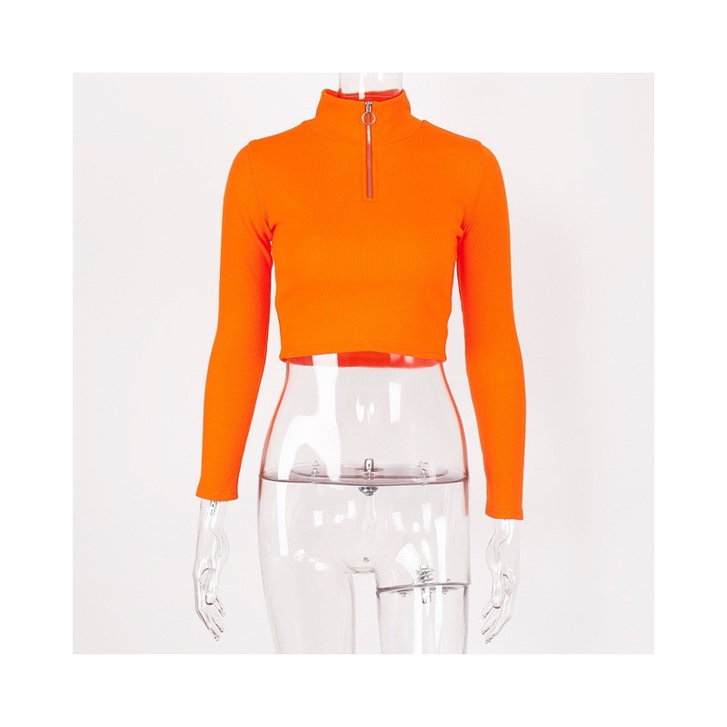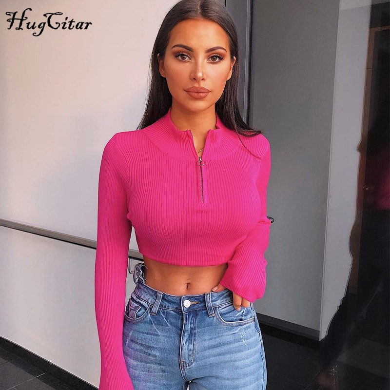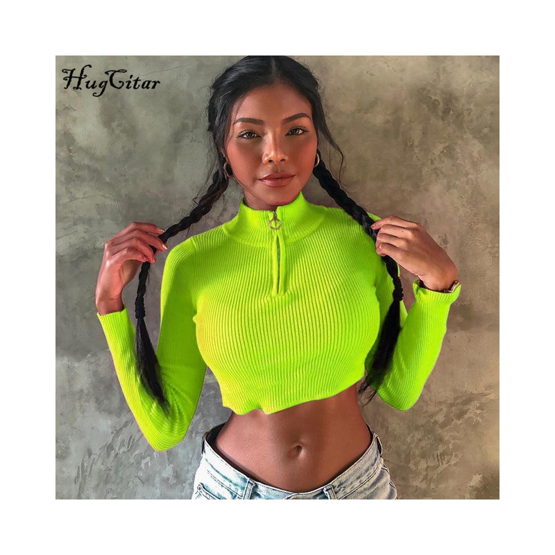 Hugcitar 2019 z długim rękawem zipper patchwork sexy krótkie bluzki jesień zima kobiety neon bodycon t-shirty streetwear klub st