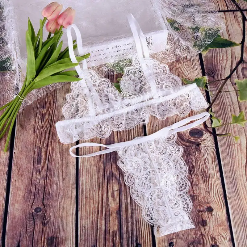 Seksowny komplet bielizny damskiej przezroczysty koronkowy Babydoll otwarty biustonosz zestaw kwiatowy fioletowy bielizna string